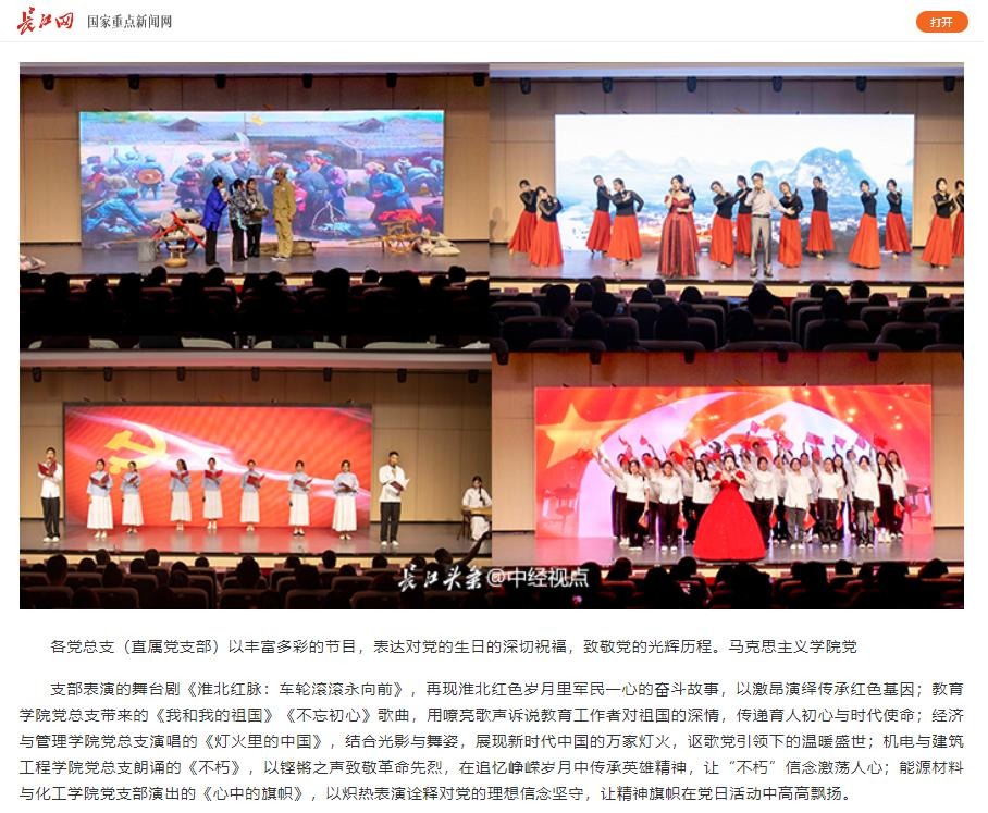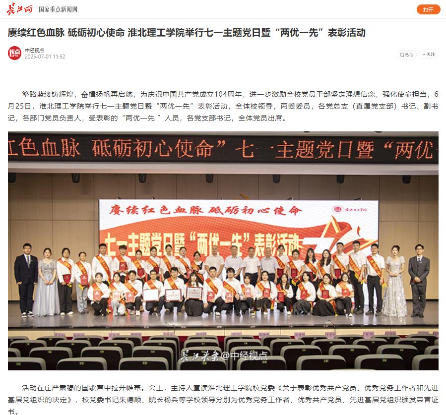 筚路蓝缕铸辉煌,奋楫扬帆再启航,为庆祝中国共产党成立104周年,进一步激励全校党员干部坚定理想信念、强化使命担当,6月25日,淮北理工学院举行七一主题党日暨“两优一先”表彰活动,全体校领导,两委委员,各党总支(直属党支部)书记、副书记,各部门党员负责人,受表彰的“两优一先 ”人员,各党支部书记,全体党员出席。对此,长江网进行了报道:
