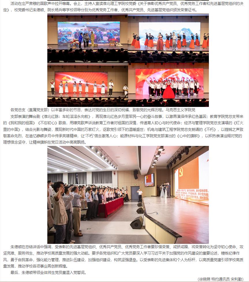 筚路蓝缕铸辉煌,奋楫扬帆再启航,为庆祝中国共产党成立104周年,进一步激励全校党员干部坚定理想信念、强化使命担当,6月25日,淮北理工学院举行七一主题党日暨“两优一先”表彰活动,全体校领导,两委委员,各党总支(直属党支部)书记、副书记,各部门党员负责人,受表彰的“两优一先 ”人员,各党支部书记,全体党员出席。对此,中经视点进行了报道: