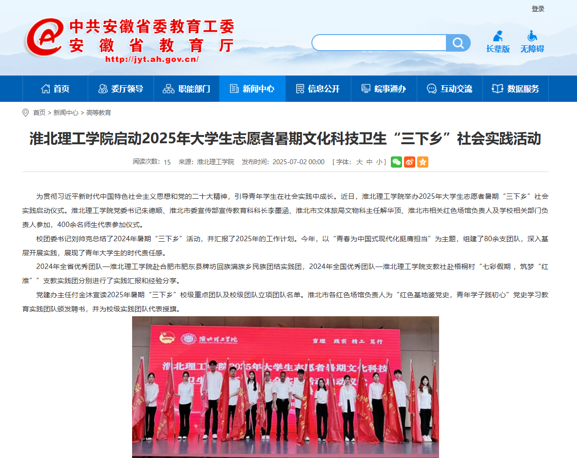 为贯彻习近平新时代中国特色社会主义思想和党的二十大精神,引导青年学生在社会实践中成长。近日,淮北理工学院举办2025年大学生志愿者暑期“三下乡”社会实践启动仪式。淮北理工学院党委书记朱德顺、淮北市委宣传部宣传教育科科长李墨涵、淮北市文体旅局文物科主任解华顶、淮北市相关红色场馆负责人及学校相关部门负责人参加,400余名师生代表参加仪式。对此,安徽教育网进行了报道: