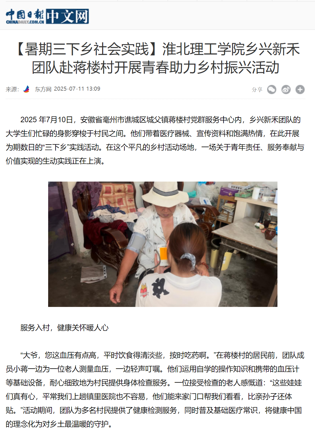 2025年7月10日,安徽省毫州市谯城区城父镇蒋楼村党群服务中心内,乡兴新禾团队的大学生们忙碌的身影穿梭于村民之间。他们带着医疗器械、宣传资料和饱满热情,在此开展为期数日的“三下乡”实践活动。在这个平凡的乡村活动场地,一场关于青年责任、服务奉献与价值实现的生动实践正在上演。对此,中国日报进行了报道: