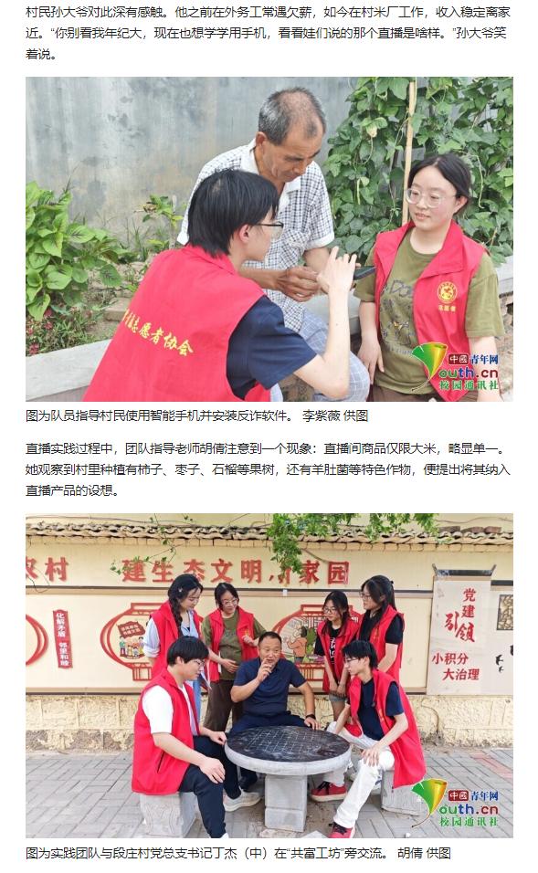 淮北理工学院教育学院基层服务践行团队的6名大学生志愿者,于7月1日至7月7日,深入安徽省淮北市杜集区段庄村,开展暑期“三下乡”社会实践活动。聚焦“数字赋能,电商驱动”主题,该团队依托学校“一村一主播”项目,通过直播带货、短视频推广及智能技术帮扶,助力段庄村集体企业“共富工坊”大米品牌提升影响力,探索数字技术助力乡村产业振兴新路径。对此,中国青年网进行了报道: