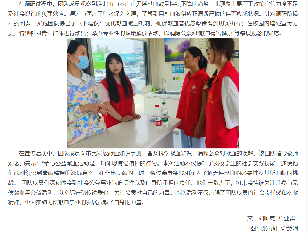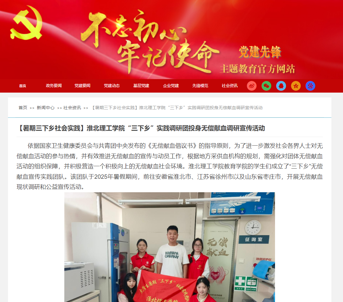 依据国家卫生健康委员会与共青团中央发布的《无偿献血倡议书》的指导原则,为了进一步激发社会各界人士对无偿献血活动的参与热情,并有效推进无偿献血的宣传与动员工作,根据地方采供血机构的规划,需强化对团体无偿献血活动的组织保障,并积极营造一个积极向上的无偿献血社会环境。淮北理工学院教育学院的学生们成立了“三下乡”无偿献血宣传实践团队。该团队于2025年暑假期间,前往安徽省淮北市、江苏省徐州市以及山东省枣庄市,开展无偿献血现状调研和公益宣传活动。对此,党建先锋网进行了报道: