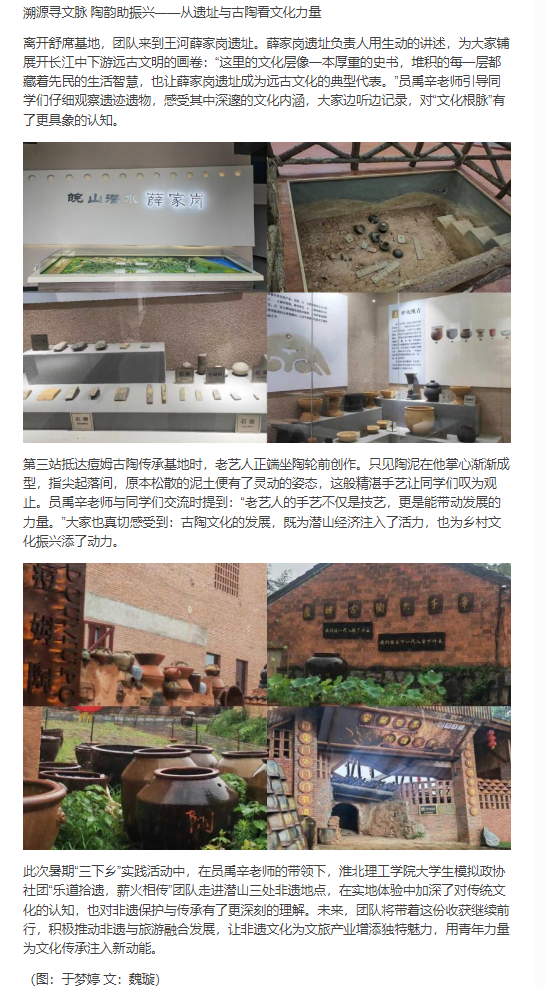 2025年7月2日至8日,淮北理工学院大学生模拟政协社团牵头组织的“乐道拾遗,薪火相传”暑期三下乡社会实践团队,在社团指导老师员禹辛的带领下,带着对传统文化的敬畏与探索欲,深入安徽省安庆市潜山县,开启了一场解码非遗基因、传承文化根脉的实践之旅。此次活动以传承与弘扬非物质文化遗产为核心,既致力于挖掘潜山非遗的深厚底蕴,也为推动当地非遗与文旅融合发展探寻可行路径。对此,中国青年日报: