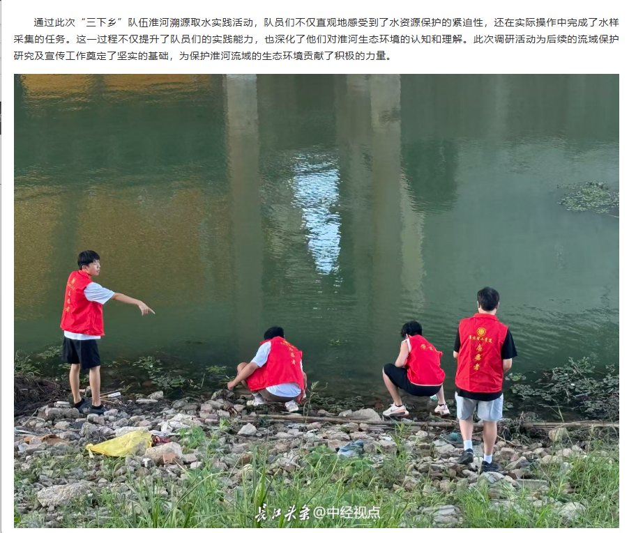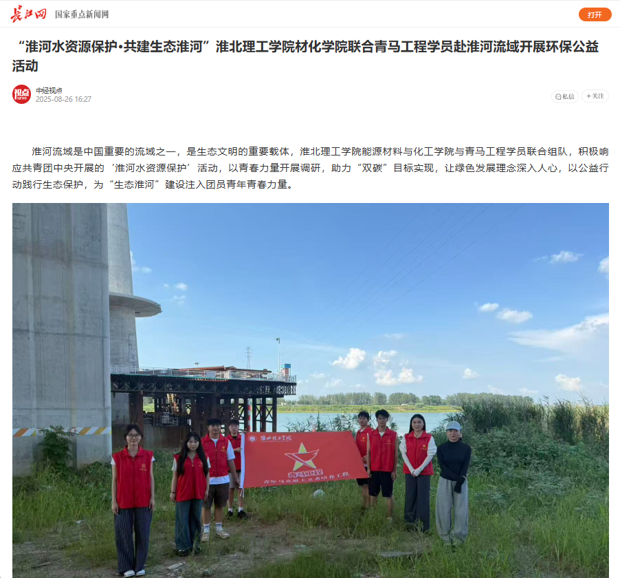 淮河流域是中国重要的流域之一,是生态文明的重要载体,淮北理工学院能源材料与化工学院与青马工程学员联合组队,积极响应共青团中央开展的‘淮河水资源保护’活动,以青春力量开展调研,助力“双碳”目标实现,让绿色发展理念深入人心,以公益行动践行生态保护,为“生态淮河”建设注入团员青年青春力量。对此,长江网进行了报道: