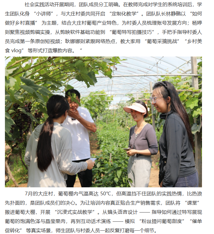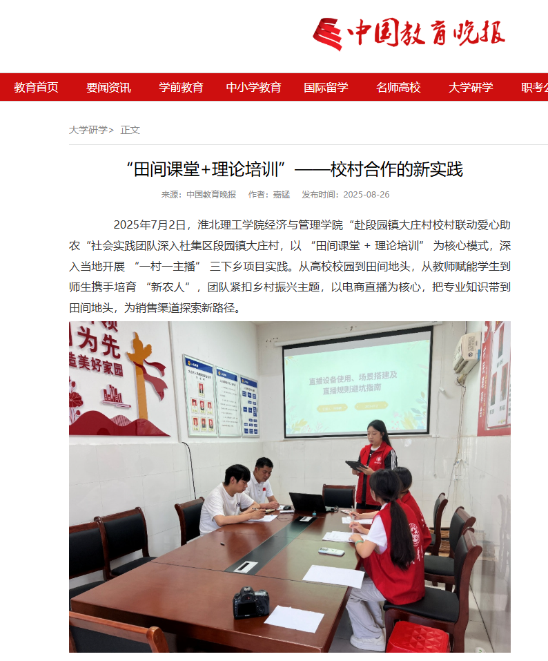 2025年7月2日,淮北理工学院经济与管理学院“赴段园镇大庄村校村联动爱心助农“社会实践团队深入杜集区段园镇大庄村,以 “田间课堂 + 理论培训” 为核心模式,深入当地开展 “一村一主播” 三下乡项目实践。从高校校园到田间地头,从教师赋能学生到师生携手培育 “新农人”,团队紧扣乡村振兴主题,以电商直播为核心,把专业知识带到田间地头,为销售渠道探索新路径。对此,中国教育晚报进行了报道: