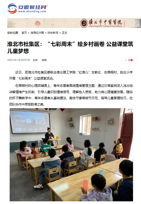 近日,团淮北市杜集区委联合淮北理工学院“红淮儿”支教社,在梧桐村、段庄小学开展“七彩周末”公益课堂活动。对此,安徽财经网进行了报道: