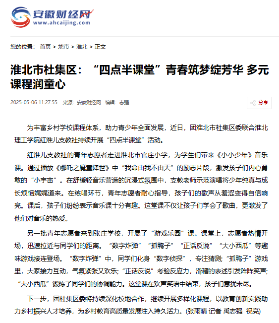 为丰富乡村学校课程体系,助力青少年全面发展,近日,团淮北市杜集区委联合淮北理工学院红淮儿支教社持续开展“四点半课堂”活动。对此,安徽财经网进行了报道: