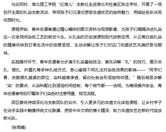 为培养青少年的文化自信,加强素质教育,丰富学生的课余生活,近日,团淮北市杜集区委联合淮北理工学院“红淮儿”支教社青年志愿者为孩子们带来了一节有趣且富有创意的非遗文化课。对此,安徽财经网进行了报道: