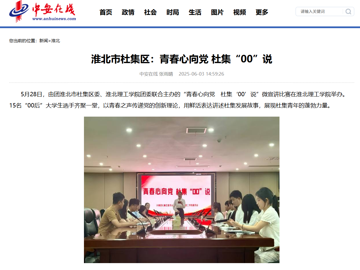 5月28日,由团淮北市杜集区委、淮北理工学院团委联合主办的“青春心向党 杜集‘00’说”微宣讲比赛在淮北理工学院举办。15名“00后”大学生选手齐聚一堂,以青春之声传递党的创新理论,用鲜活表达讲述杜集发展故事,展现杜集青年的蓬勃力量。对此,中安在线进行了报道: