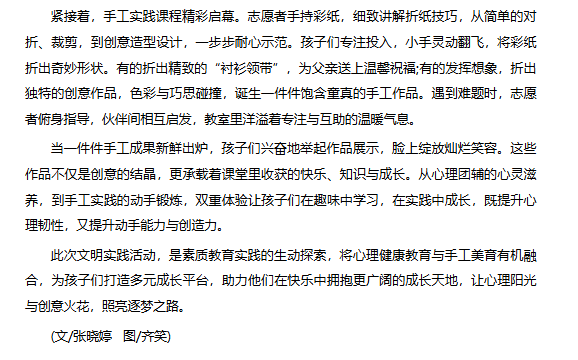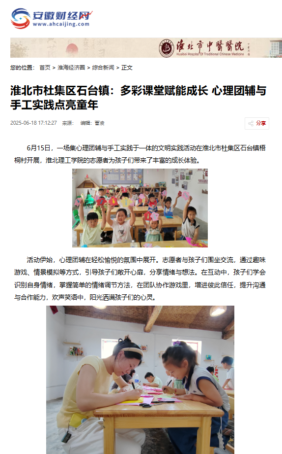 6月15日,一场集心理团辅与手工实践于一体的文明实践活动在淮北市杜集区石台镇梧桐村开展,淮北理工学院的志愿者为孩子们带来了丰富的成长体验。对此,安徽财经网进行了报道:
