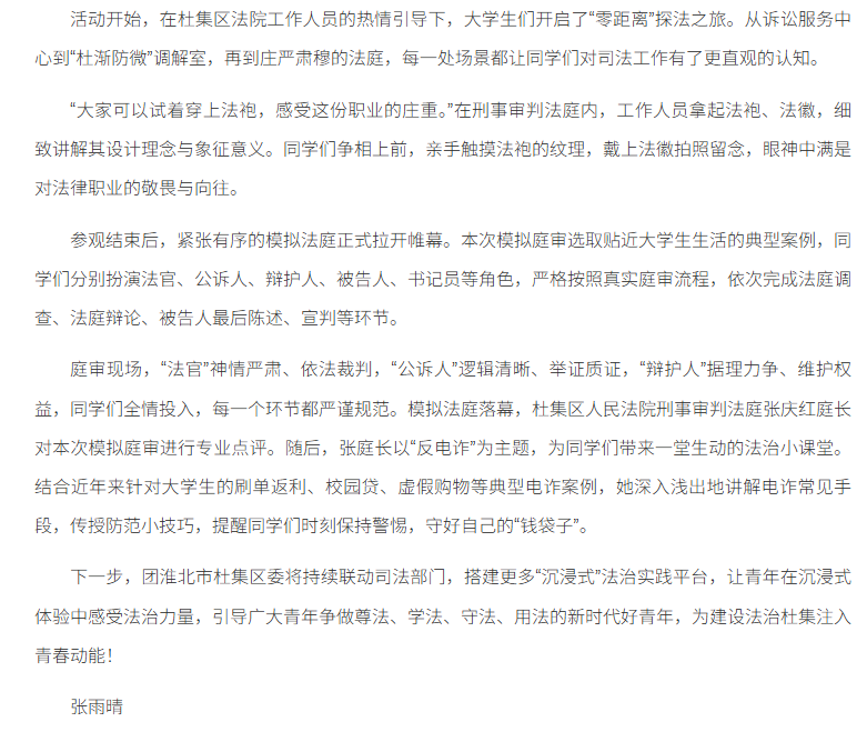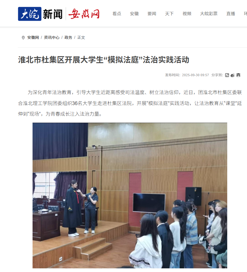 为深化青年法治教育,引导大学生近距离感受司法温度、树立法治信仰,近日,团淮北市杜集区委联合淮北理工学院团委组织36名大学生走进杜集区法院,开展“模拟法庭”实践活动,让法治教育从“课堂”延伸到“现场”,为青春成长注入法治力量。对此,安徽网进行了报道: