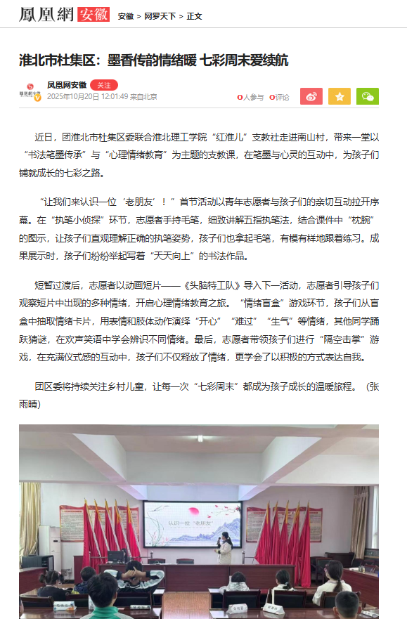近日,团淮北市杜集区委联合淮北理工学院“红淮儿”支教社走进南山村,带来一堂以“书法笔墨传承”与“心理情绪教育”为主题的支教课,在笔墨与心灵的互动中,为孩子们铺就成长的七彩之路。对此,凤凰网安徽进行了报道: