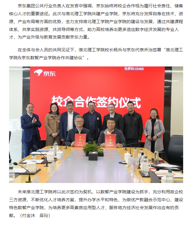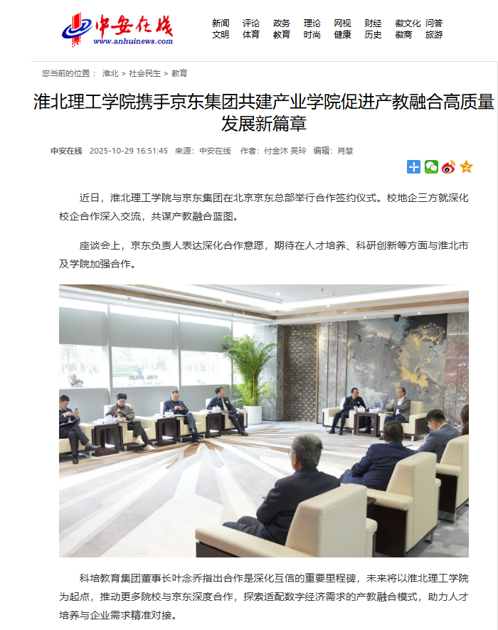 近日,淮北理工学院与京东集团在北京京东总部举行合作签约仪式。校地企三方就深化校企合作深入交流,共谋产教融合蓝图。对此,中安在线进行了报道: