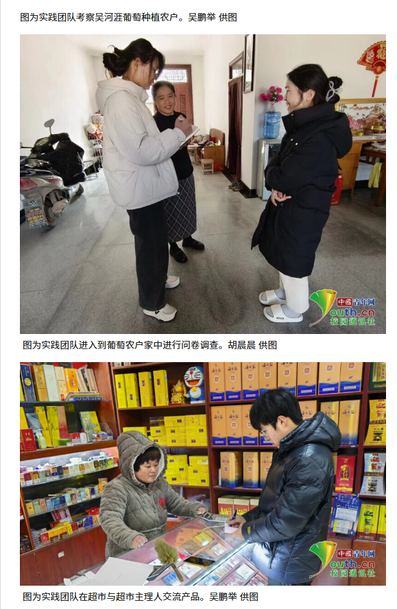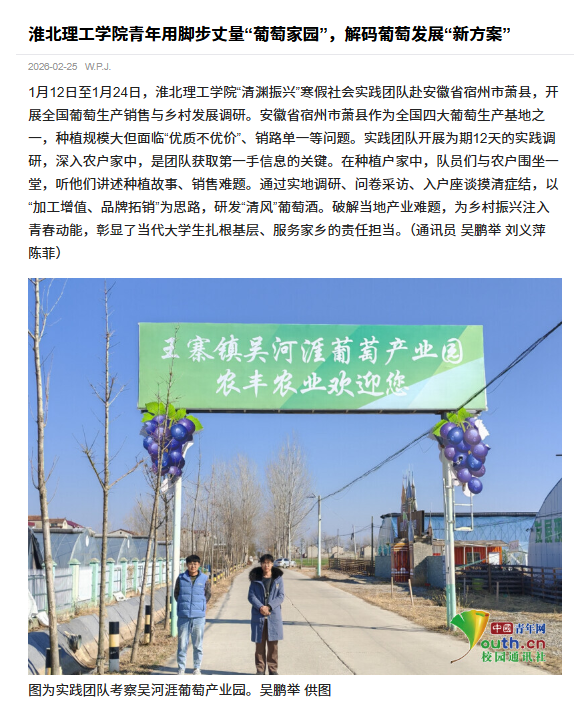 1月12日至1月24日,淮北理工学院“清渊振兴”寒假社会实践团队赴安徽省宿州市萧县,开展全国葡萄生产销售与乡村发展调研。安徽省宿州市萧县作为全国四大葡萄生产基地之一,种植规模大但面临“优质不优价”、销路单一等问题。实践团队开展为期12天的实践调研,深入农户家中,是团队获取第一手信息的关键。在种植户家中,队员们与农户围坐一堂,听他们讲述种植故事、销售难题。通过实地调研、问卷采访、入户座谈摸清症结,以“加工增值、品牌拓销”为思路,研发“清风”葡萄酒。破解当地产业难题,为乡村振兴注入青春动能,彰显了当代大学生扎根基层、服务家乡的责任担当。对此,中青校园网进行了报道: