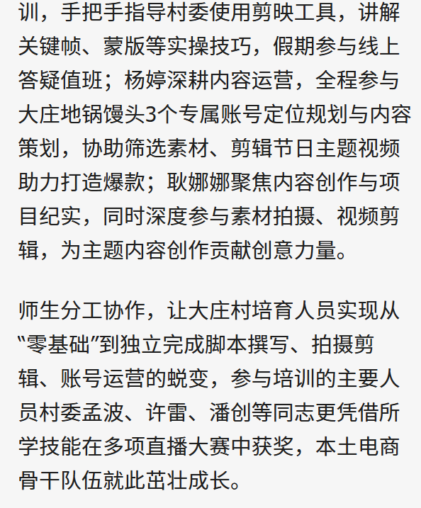 为深入践行高校服务地方发展使命,以专业力量赋能乡村振兴,淮北理工学院联合淮北市杜集区组织部牵头打造大庄村“一村一主播”校地合作助农项目。其中,大庄村项目由经济与管理学院市场营销教研室雷旭老师担任负责人,杨婷、林静鹂、耿娜娜三位同学组成核心学生团队,师生同心扎根乡村、深耕细作,通过人才培育、内容创作、技能帮扶、产业对接全链条发力,为大庄村培育出“带不走”的本土电商骨干队伍,让乡村农产借数字东风出圈走红。团队扎实的工作成效与显著的助农成果,自项目启动至今,现收获村、镇两级组织书面认可与表扬,获颁表扬信,以校地协同之力激活乡村振兴新动能。对此,环球日报进行了报道: