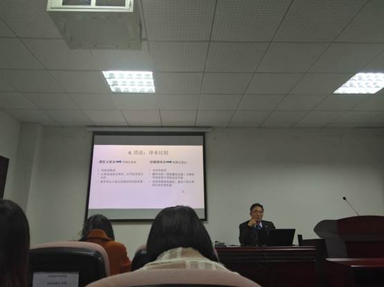 讲座伊始,为了让大家进一步了解沙博理和葛浩文两位译者及为后续比较两位译者译本的差异性,任东升教授就两位译者的个人背景及其翻译事业背景做了简单介绍。随后,任教授指出:翻译是人类出于交际需要以不同语言符号系统为媒介的跨文化转换思维活动和生产实践,翻译活动从个人自由生产经由机构组织、监管“进化”到由国家策动、资助也体现出社会的复杂化。并对国家行为、国家翻译实践、翻译机构、制度化译者四者的关系做了简要解释。此外,他还提到:翻译不是个人的事情,是带有社会属性的。翻译活动的社会属性导致两种差异化的翻译出现:一种是强调文本的政治价值和社会效益,由国家策动、组织实施、选材政审的制度化翻译;另一种则是更加强调文本的商品价值和商业效益,注重市场激励、自由竞争、选材自由的市场化翻译。最后,任教授通过语例对照分析了端木蕻良的小说《鴜鹭湖的忧郁》、《雪夜》沙博理译本和葛浩文译本,使大家更加清晰地认识到制度化翻译与市场化翻译在翻译策动、选材、策略和译作传播途径上的显著差别,并表明:译文的差别表征两类译者的政治文化身份差别,而对译本质量评估不可单以市场效果为指标,国家翻译实践与面向市场的翻译并非对立关系,而是相互补充的关系。