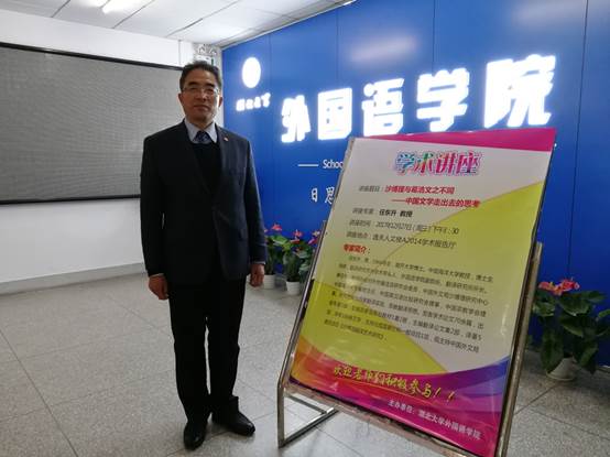 2017年12月27日(周三)下午3点半,湖北大学外国语学院特邀中国海洋大学外国语学院副院长任东升教授在逸夫人文楼A2014学术报告厅为我院学子做了一场题为“沙博理与葛浩文之不同——中国文学走出去的思考”的学术专题讲座。会议由我院杨元刚教授主持,外国语学院老师和17级全体研究生参加了此次讲座。