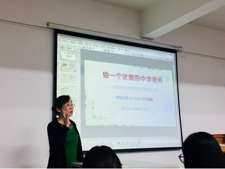讲座开始,刘老师解释道为什么要做“优雅的老师”。“优秀”只是能力上的要求,而“优雅”是综合的内在价值追求,既有专业上的,又有生活上的。教师发展和学生发展一样,都应该是全面发展。