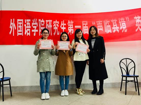 2018年03月21日晚6时30分,外国语学院研究生在逸夫楼A3002成功举办了第一届“声临其境”英语配音大赛。来自学科教学英语、笔译和英语语言文学的11名同学参加了比赛。16级的朱汉敏学姐、张育林学姐、SOMA剧团的艾舒阿克和安娅婷担任了评委。