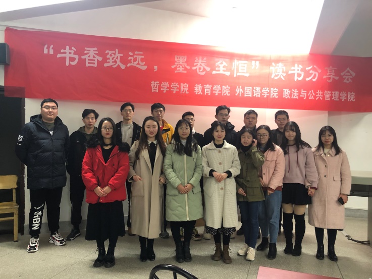 2019年12月8日晚上六点半,由外国语学院,哲学学院,教育学院,政法与公共管理学院共同举办的读书分享会在逸夫人文楼A2014进行了题为“书香致远,墨卷至恒”的读书分享会活动,由来自四个学院的分享者与众位读书爱好者参加了此次活动。
