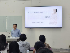 9月13日,湖北省委外办外事翻译中心张银老师莅临湖北大学外国语学院,为学院2022级翻译专业新生带来了题为“The Pursuit of Faithfulness and Expressiveness——外事翻译浅谈”的讲座。本次讲座在逸夫楼A座1010举行,由外国语学院殷燕教授主持。