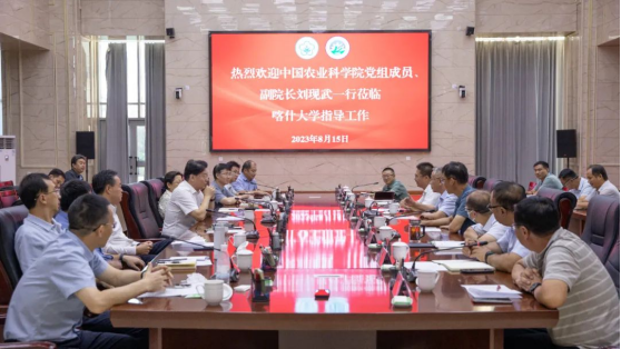 8月15日,中国农业科学院党组成员、副院长刘现武一行来我校调研交流。喀什大学党委书记丁邦文陪同调研并座谈,在家校领导班子成员和相关部门、学院负责同志参加此次座谈。