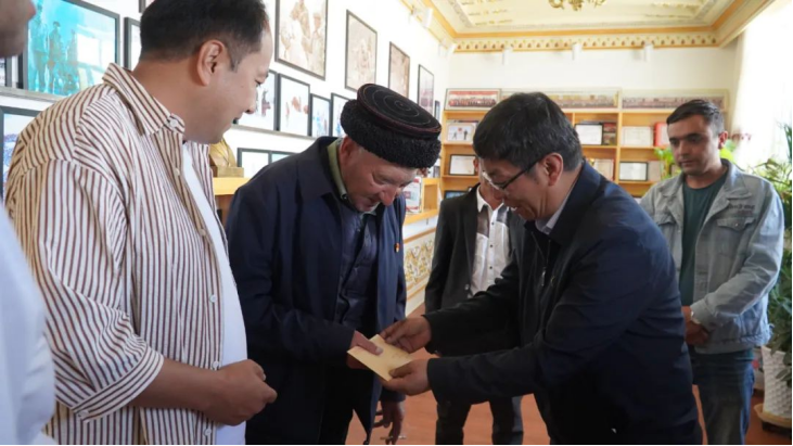 随后,我校师生来到了“时代楷模”拉齐尼·巴依卡家中看望慰问了拉齐尼·巴依卡的家人。拉齐尼·巴依卡的父亲巴依卡·凯力迪别克巴依卡热情地欢迎师生并带领师生参观了家中的荣誉展厅,展厅里整齐陈列着拉齐尼·巴依卡生前的荣誉证书和奖章,同学们深受鼓舞和震撼,表示将继续传承好拉齐尼·巴依卡的爱党爱国精神。