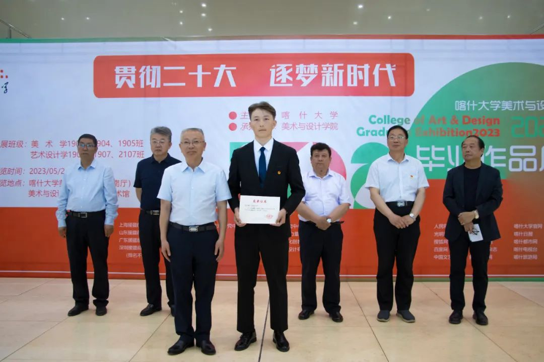 开幕仪式上在场的校领导班子成员为美术与设计学院毕业作品获奖者颁发奖状。