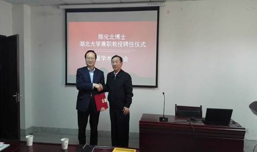 随后,校党委书记尚钢教授向陈化北博士颁发了聘书并合影留念。陈化北博士发表了感言。他深情地回顾了与湖北大学及尚钢教授的渊源,赞许我校高度重视国际交流与合作工作。尚钢在讲话中也指出,能够邀请到陈化北博士担任我校兼职教授,既是学校的荣幸,也是外国语学院的荣幸,更是日语专业学生的荣幸,欢迎陈化北教授以后常回湖大看看,为同学们提供更多的聆听授课的机会。