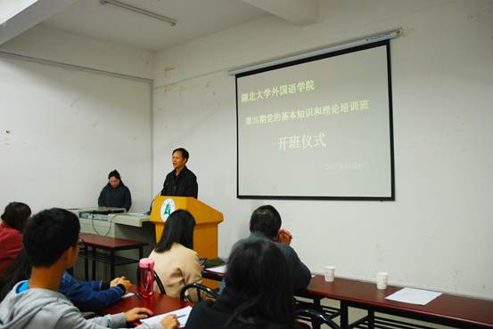 11月6日晚7点,湖北大学外国语学院第25期党的基本知识和理论培训班开班仪式暨第一讲在逸夫楼A1010室隆重举行。出席本次开班仪式的有湖北大学党建组织员闸文朗、外国语学院党委书记、党校校长林二友、生命科学学院党委副书记许良发、外国语学院党委副书记、党校副校长罗超及第25期党校36名学员。