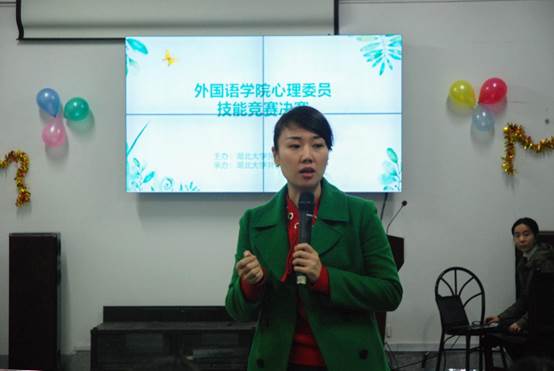 12月19日下午,由湖北大学外国语学院学生会主办的心理技能竞赛决赛于逸夫楼A3014完满举行。此次竞赛的评委有:湖北大学心理健康教育中心主任柳珺珺、外国语学院党委副书记占婧和外国语学院辅导员心理健康教育工作指导教师邱俊。