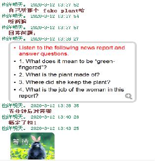 万莎老师交流了她在线教学的一些做法。在视听说学习上,万老师利用教学平台实施考勤签到、问题讨论等操作;课后,将学习材料及时发布至QQ群中,方便学生线上与线下相结合的深化学习。在综合课程学习上,万老师利用QQ群的“作业功能”,严格要求学生按时保质完成翻译作业,有针对性地帮助学生完成课程对接。