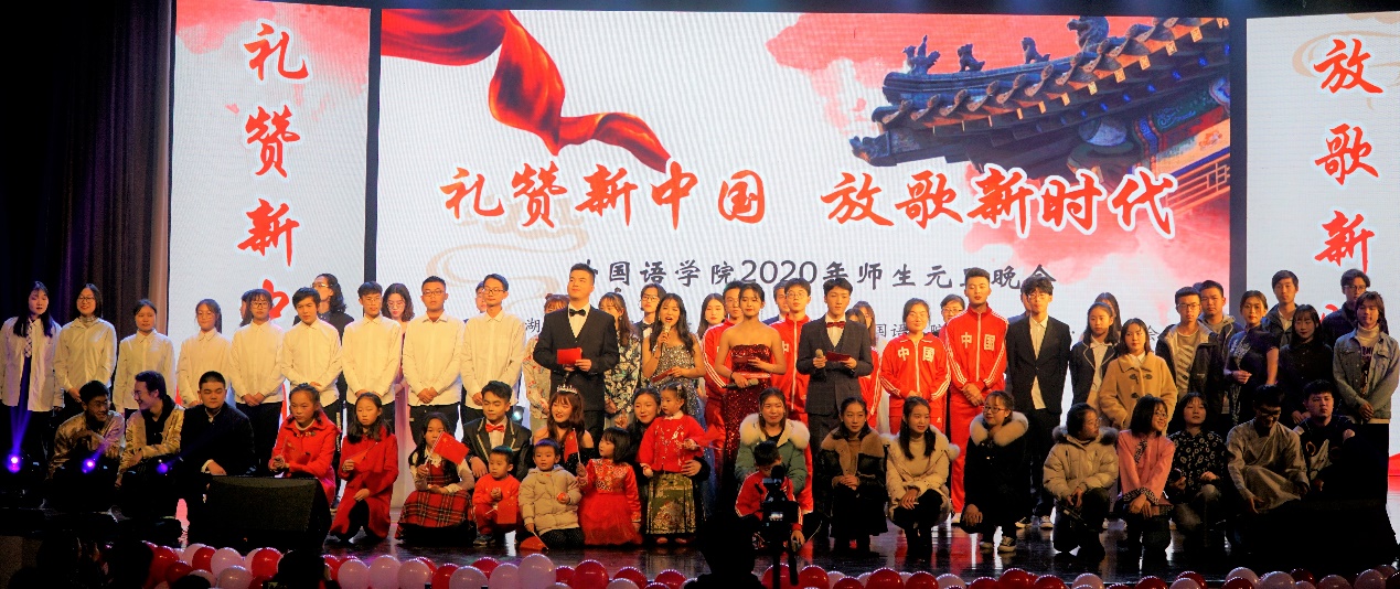 2019年12月29日晚7点,由湖北大学外国语学院主办,湖北大学外国语学院团委、学生会、研究生会联合承办的2020年湖北大学外国语学院“礼赞新中国·放歌新时代”师生元旦晚会于小礼堂顺利举行。外国语学院院长张庆宗、专职组织员郁时全、党委副书记占婧和维吾尔族辅导员阿曼古丽莅临本场晚会。