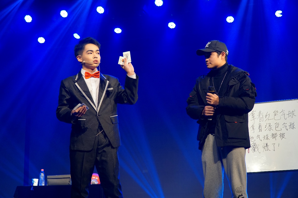 在晚会第一篇章,首先外院老师及各班班长带来舞蹈《时代变迁》,涵盖了70年代交际舞、80年代迪斯科,新生代广播体操等不同时段的舞蹈,记录下青葱时光;研究生会的朗诵《雨巷》(英文版)在诗歌原有的感情基调上融入英语的热情和暖意,给观众们带来不同的听觉享受;魔术《创造奇迹》以“意念的力量”为主题,层出不穷的魔术表演让观众欢呼连连。