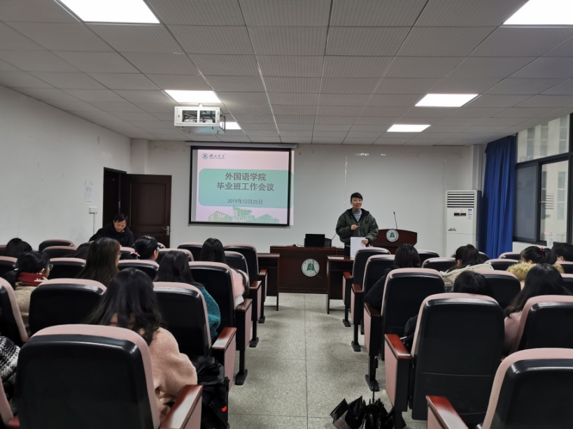 12月25日下午,外国语学院党委在逸夫人文楼A2014会议室召开2020届毕业班工作会议,学院党委书记林二友在会上讲话,党委副书记占婧主持会议,辅导员冷自衍、毕业班班长、心理委员和就业联络人等学生干部参加会议。