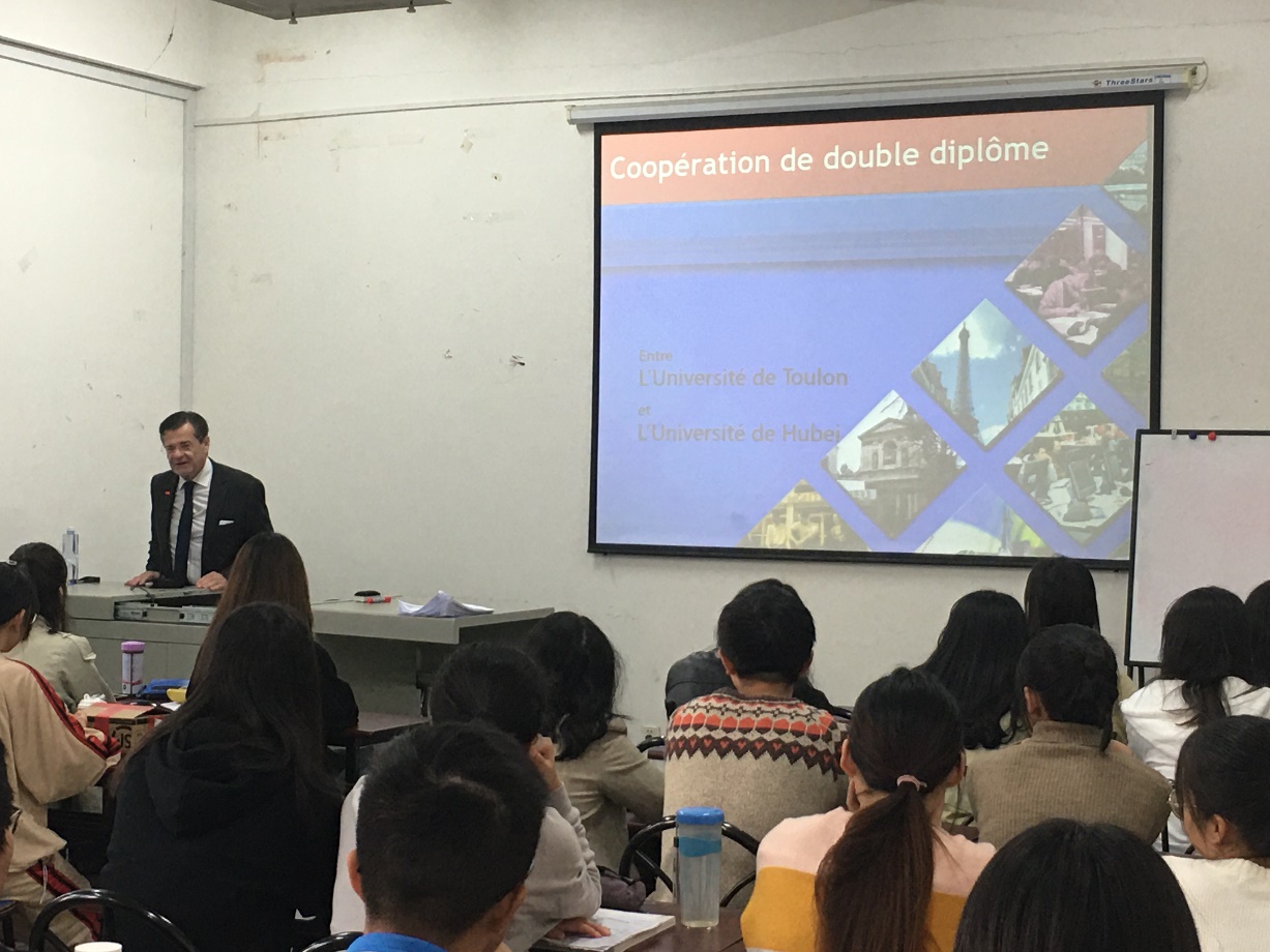 2019年10月30日,法国土伦大学管理学院长Jean Galanos和巫晓慧博士应我院法语系邀请,在湖北大学逸夫楼A1010教室就校级交流项目土伦大学3+1项目进行了宣讲交流。此次宣讲交流会由法语系主任张凌副教授主持,法语系学生和教师参加。