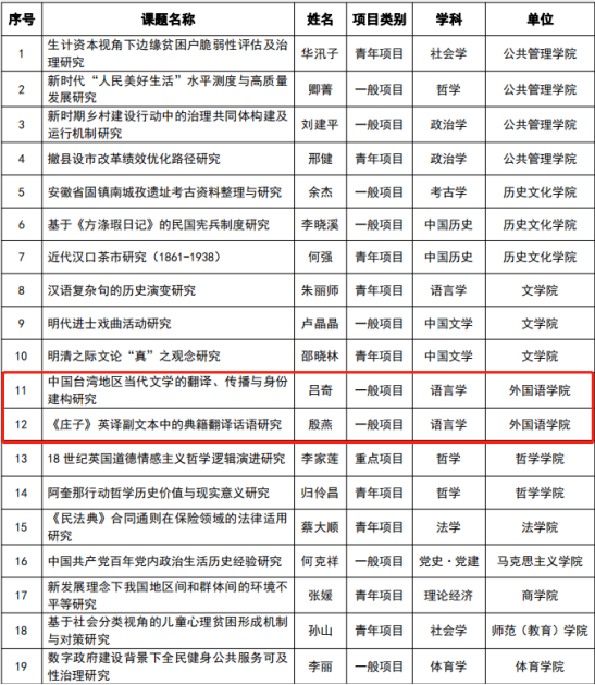 9月24日,全国哲学社会科学工作办公室正式公布2021年国家社科基金年度项目和青年项目立项名单,学校共有19个项目获批立项资助。其中,外国语学院喜获2项国家社科基金一般项目,分别是:吕奇教授主持的《中国台湾地区当代文学的翻译、传播与身份建构研究》、殷燕教授主持的《<庄子>英译副文本中的典籍翻译话语研究》。
