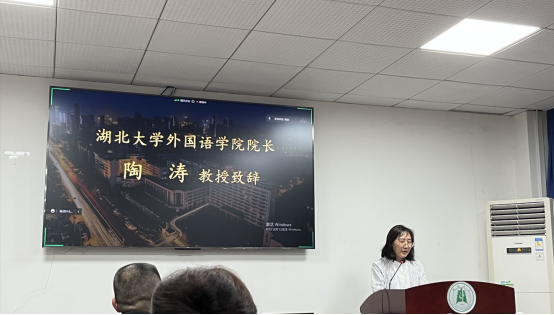陶涛院长代表学院向中国新华新闻电视网陈总一行莅临指导、向各兄弟高校和本校全体参会师生的到来表示热烈欢迎和诚挚感谢,并分别介绍了学院的基本情况以及学院翻译团队近年来服务国家战略、地方经济发展尤其是参与重大国际体育赛事语言服务、新闻服务和国际传播的相关事迹。