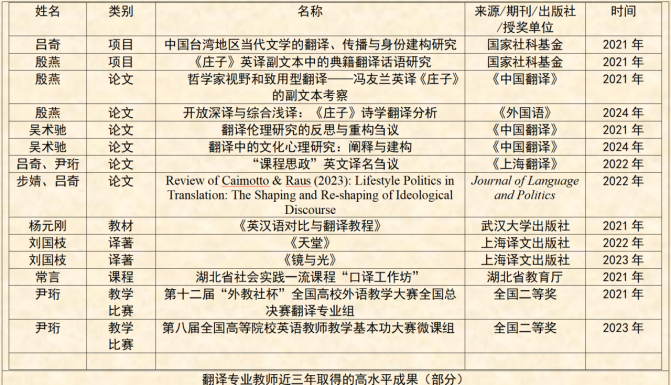 近年来,翻译专业教师获批国家社科基金2项,省部级、厅局级教研与科研项目十余项;在《中国翻译》《外国语》《上海翻译》、LAN-TTS等国内外核心期刊发表论文十余篇;出版教材、专著、译著多部;获省级一流课程1门,7人次获湖北省译协优秀学术成果奖(一等奖3人次;二等奖4人次);多人次在全国外语教学大赛、教学基本功大赛等赛事中获奖;制作并上线了四门精品在线课程。充分展现翻译专业教师的教学、科研能力。