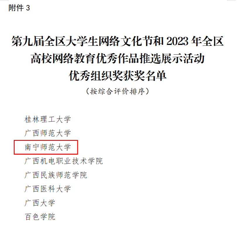 近日,由自治区教育厅和自治区党委网信办联合开展的“第九届全区大学生网络文化节和 2023 年全区高校网络教育优秀作品推选展示活动”结果公布,我校在活动中喜获佳绩。在大学生网络文化作品评选中共有20项作品获奖,其中一等奖5项、二等9项、三等奖6项;在高校网络教育优秀作品推选展示活动评选中共有5项作品获奖,其中一等奖2项、二等1项、三等奖2项。同时,我校荣获优秀组织奖。
