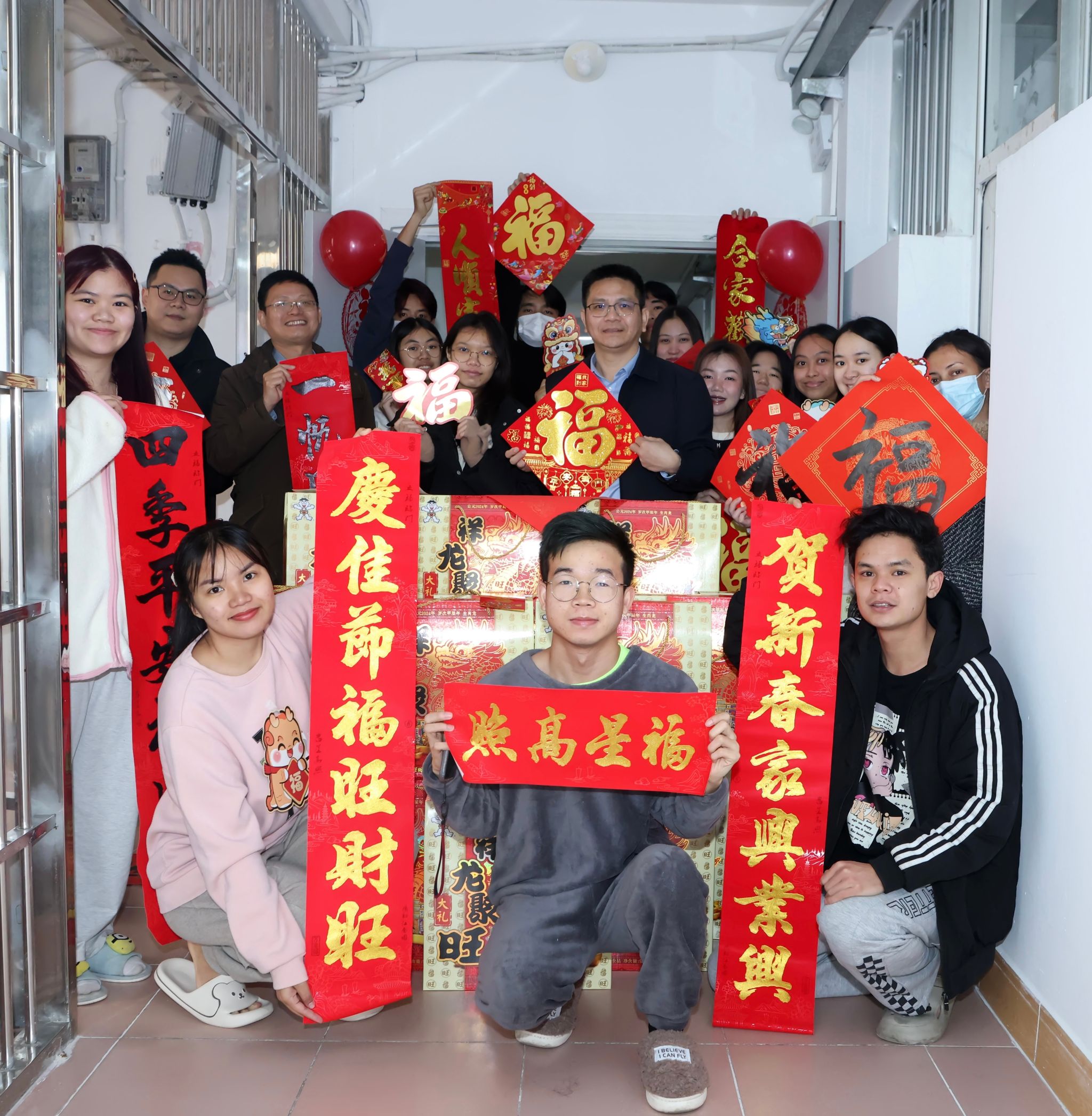 来自泰国、老挝、柬埔寨、马达加斯加、埃塞俄比亚、孟加拉的20余名留学生,选择在寒假期间留校,他们的身影成为了校园中一道美丽的风景线。为了让同学们感受到节日的喜庆祥和以及家的温暖,学校精心准备了具有中国传统文化特色的新春对联和礼包,为留校留学生送上关心与祝福,宿舍内洋溢着浓浓的节日氛围。