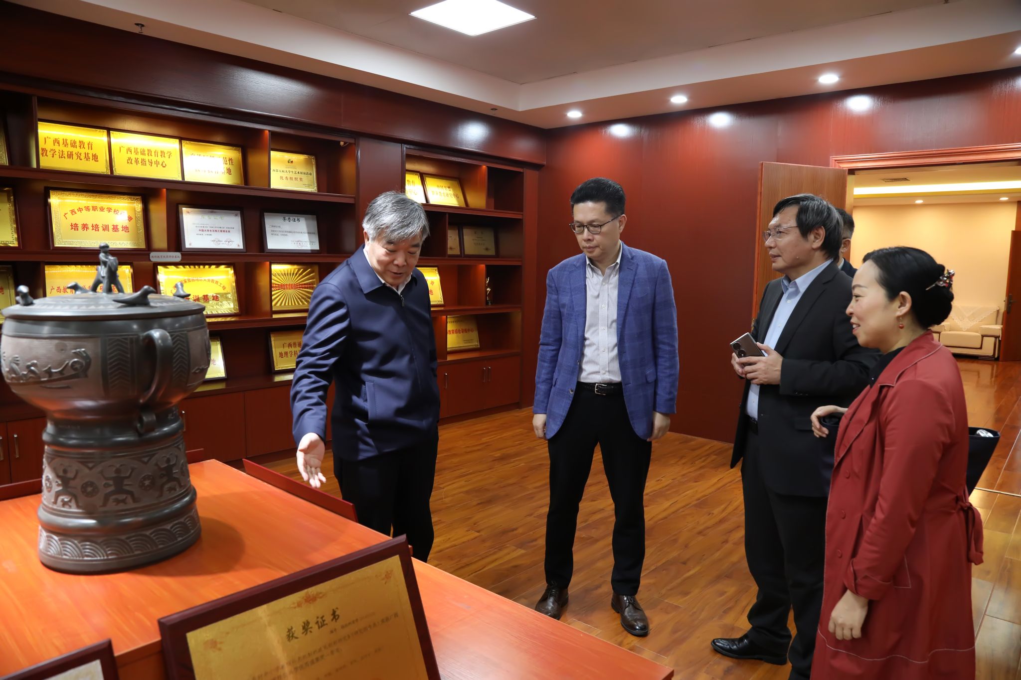 期间,张鹏书记、李传起校长陪同华桂宏校长一行前往图书馆2楼参观了学校沙盘、教师教育展。