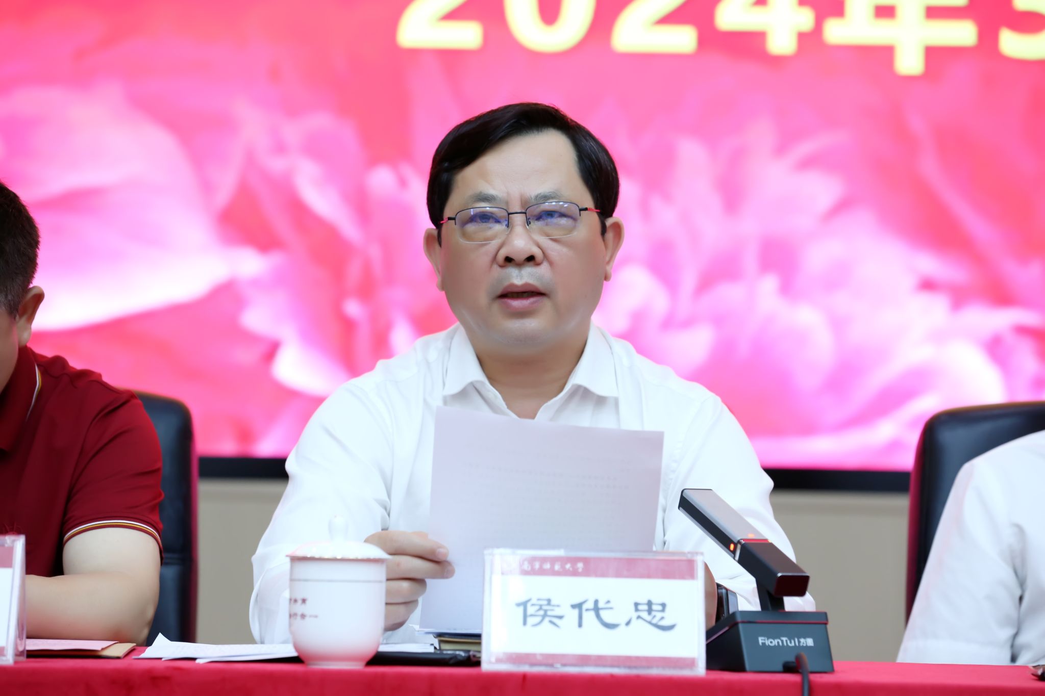 校党委副书记侯代忠代表学校党委作乡村振兴工作报告。报告总结了2023年学校乡村振兴工作取得的成绩:一是聚焦党建引领,为乡村振兴蓄势聚能。二是聚焦学科专业优势,积极助力产业振兴。三是聚焦涉农培训,促进农民就业增收。四是聚焦队伍建设,派强用好驻村干部。