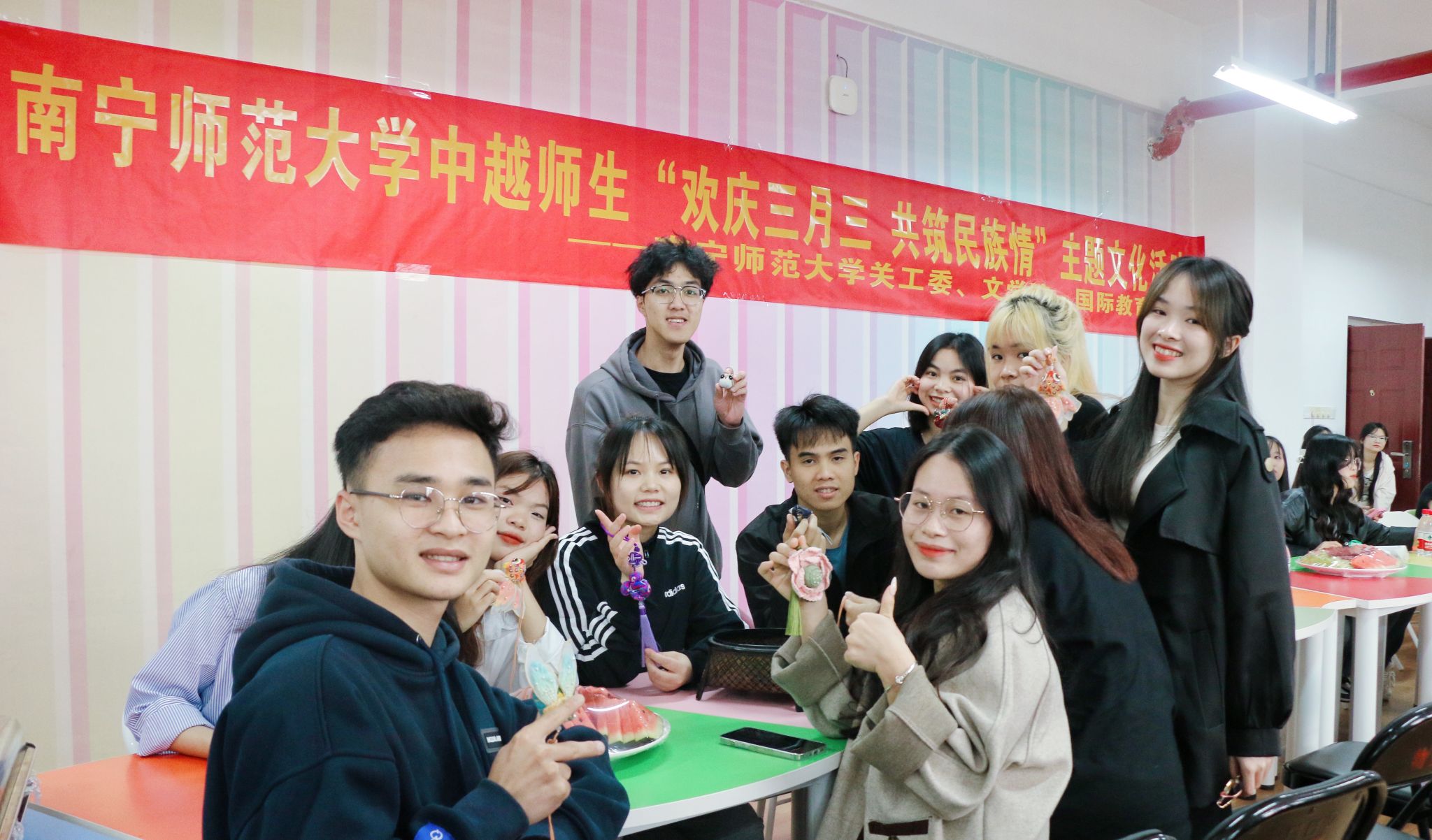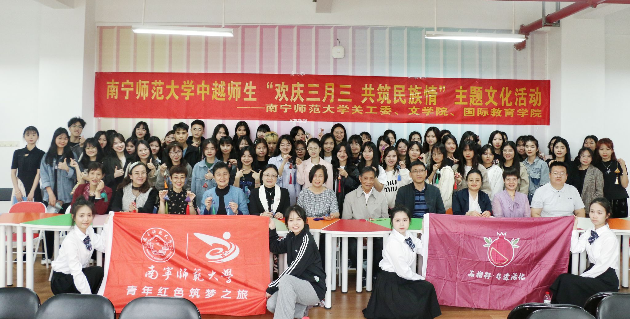 为营造广西“三月三”传统节日民族文化氛围,4月9日上午,学校关工委、文学院、国际教育学院联合举办中越师生“欢庆三月三 共筑民族情”主题文化活动。学校关工委常务副主任王甲辉,离退休教职工服务中心、文学院、国际教育学院相关负责人和中越学生代表80余人参加活动。