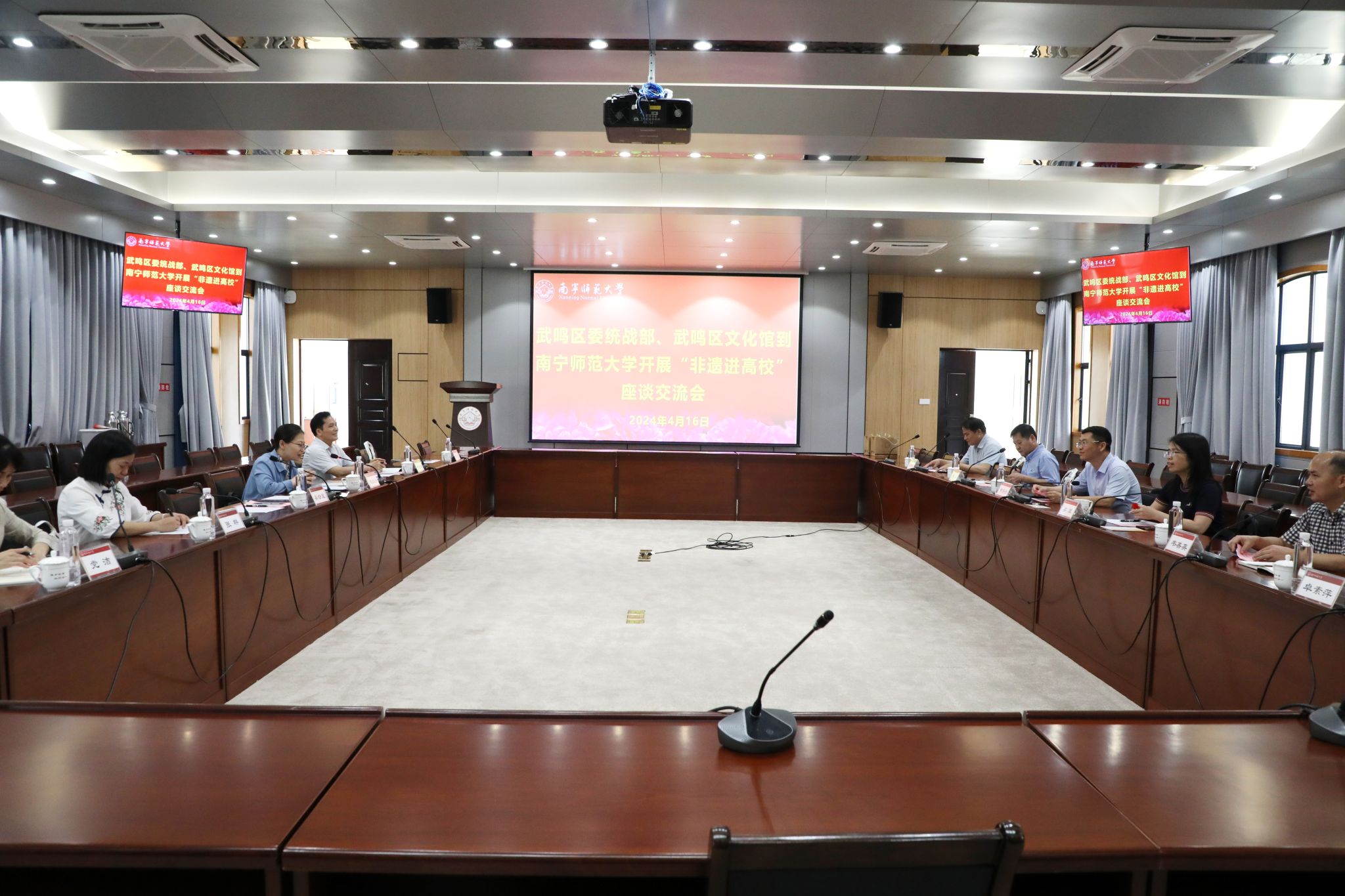 在座谈会上,武鸣区党委统战部、文化馆向我校捐赠了《壮乡武鸣 多彩非遗——南宁市武鸣区市级以上非物质文化遗产代表性项目名录》一书,校地双方就如何发挥各自优势特点共同推进武鸣区“非遗进高校”项目进行了热烈讨论。会上就双方开展“非遗进高校”工作畅谈了合作设想。