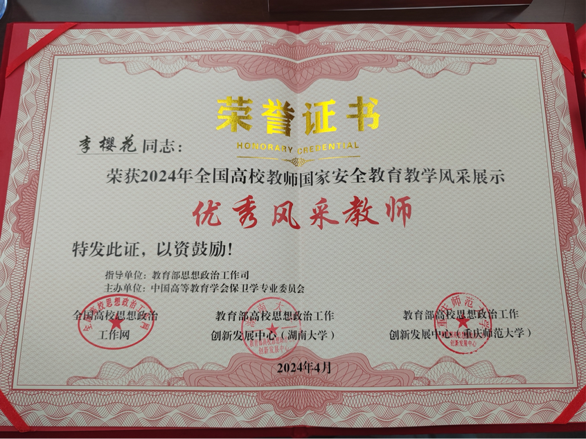 4月10日至12日,由教育部思想政治工作司指导,中国高等教育学会保卫学专业委员会、全国高校思想政治工作网、教育部高校思想政治工作创新发展中心联合主办的“2024年高校教师国家安全教育教学风采展示”在重庆师范大学举行。经过激烈角逐,我校李樱花老师在2024年高校教师国家安全教育教学风采展示活动中荣获“国家安全教育教学优秀风采教师”称号,实现了我校教师在全国国家安全教育教学竞赛成绩的新突破。