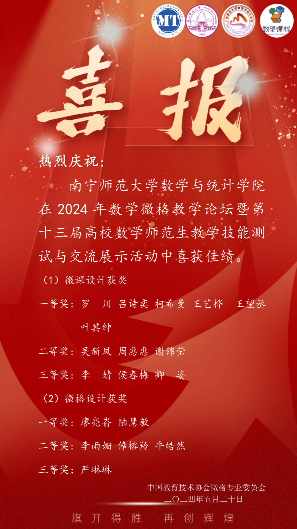 5月17日至20日,2024年数学微格教学论坛暨第十三届高校数学师范生教学技能测试与交流展示活动在广西师范大学顺利举办。我校数学与统计学院学子在比赛中表现优异,6名参赛选手、4个参赛作品全部获奖。其中,6名参加微格教学测试的选手分别获得2个一等奖,3个二等奖,1个三等奖;4个参加数学微课比赛的作品分别获得2项一等奖,1项二等奖,1项三等奖。