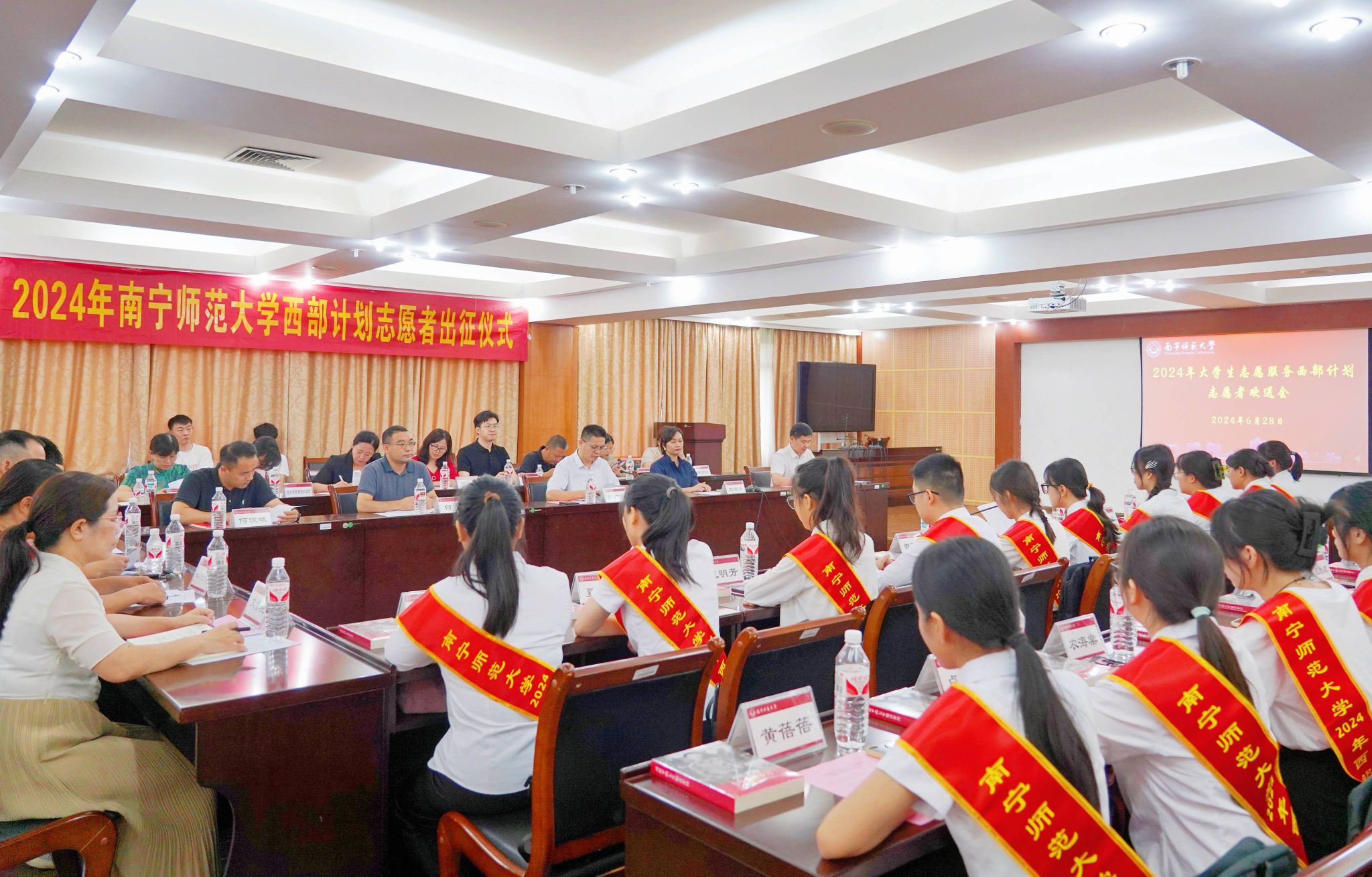 会议宣读了南宁师范大学2024年大学生志愿服务西部计划志愿者名单,为2024年西部计划志愿者颁发绶带、行囊费、奖励金,赠送加油包、志愿伞和学习书籍。