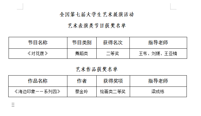 近日,教育部办公厅公布了2024年全国第七届大学生艺术展演活动优秀组织奖及各项目评选结果。我校《对花屐》荣获全国第七届大学生艺术展演活动艺术表演类节目二等奖;《海边印象——系列四》荣获全国第七届大学生艺术展演活动艺术作品类节目二等奖;学校荣获全国第七届大学生艺术展演活动高校优秀组织奖。