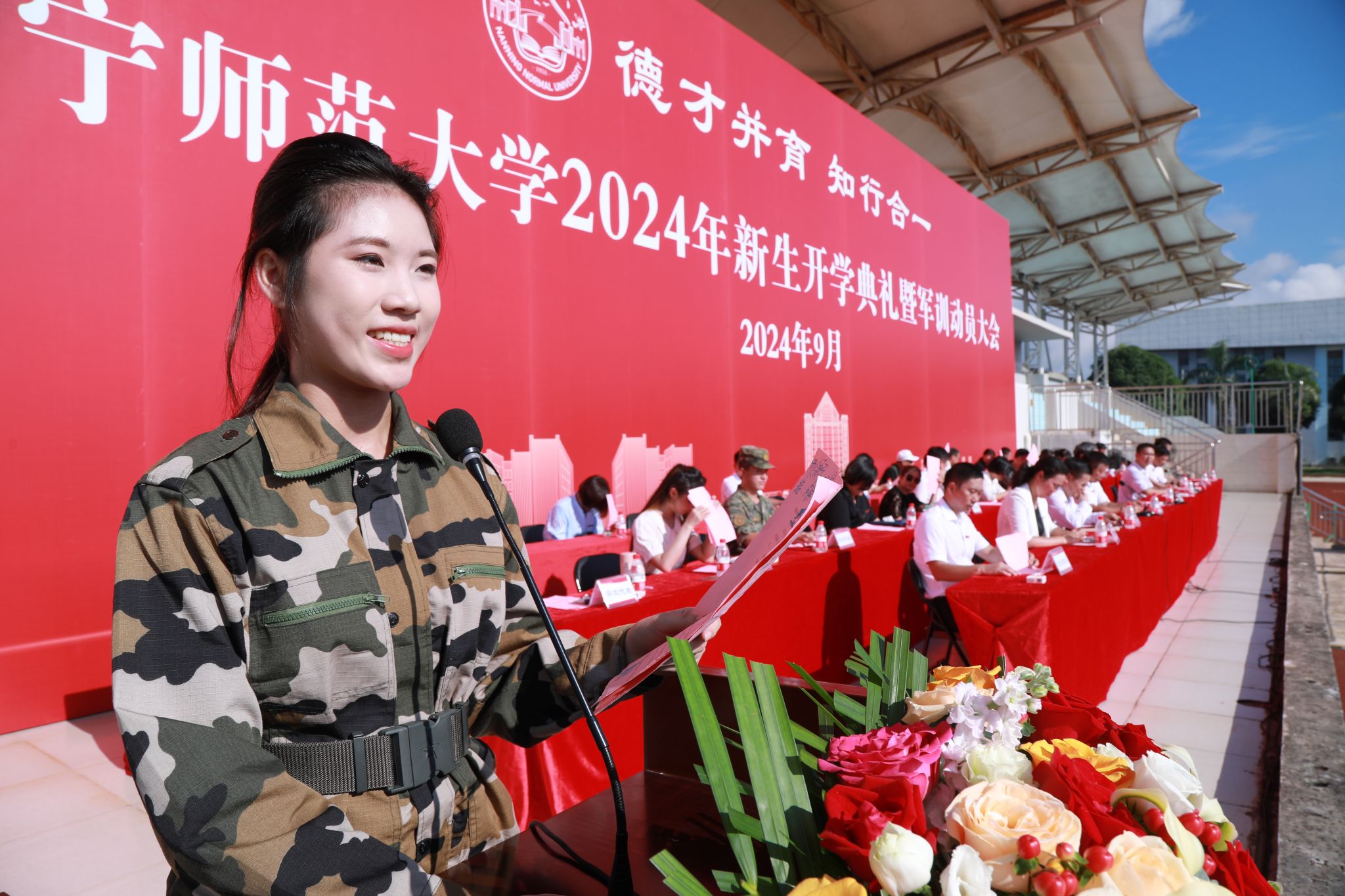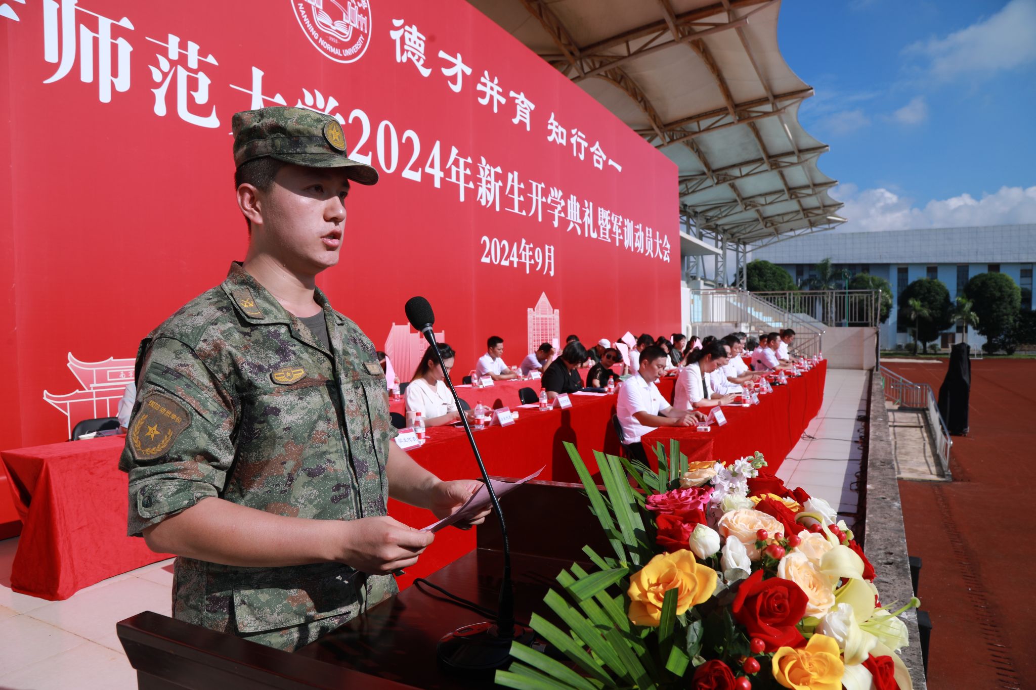 9月2日上午,我校分别在武鸣、五合两个校区同时举行2024年新生开学典礼暨军训动员大会。校领导张鹏、李传起、侯代忠、隆广庆、徐书业、赵伟、李美清、肖琦、龙妮娜,广西军区直属队副中队长黄伟仲、政治指导员陈钊,学校各职能部门负责人、学院负责人、教师代表和全体新生参加了大会。大会由学校副校长徐书业、肖琦分别在两个校区主持。